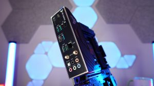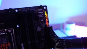 Adicionalmente la placa tiene un sector lateral con RGB, donde se puede ver las letras TUF en su orilla. Tanto esta tira cómo los conectores de la placa son compatible con Aura Sync de ASUS.