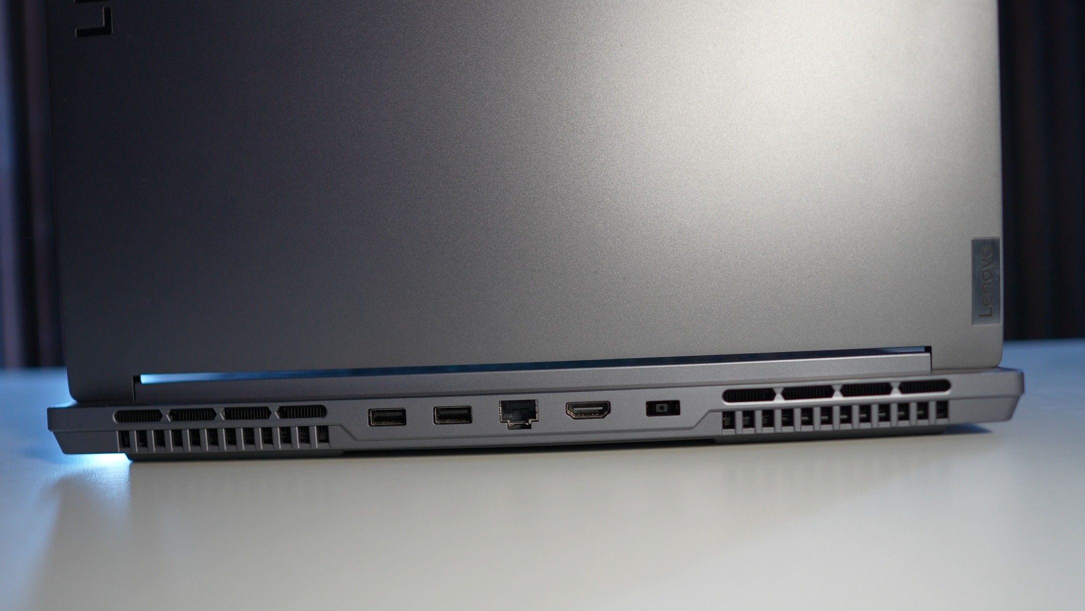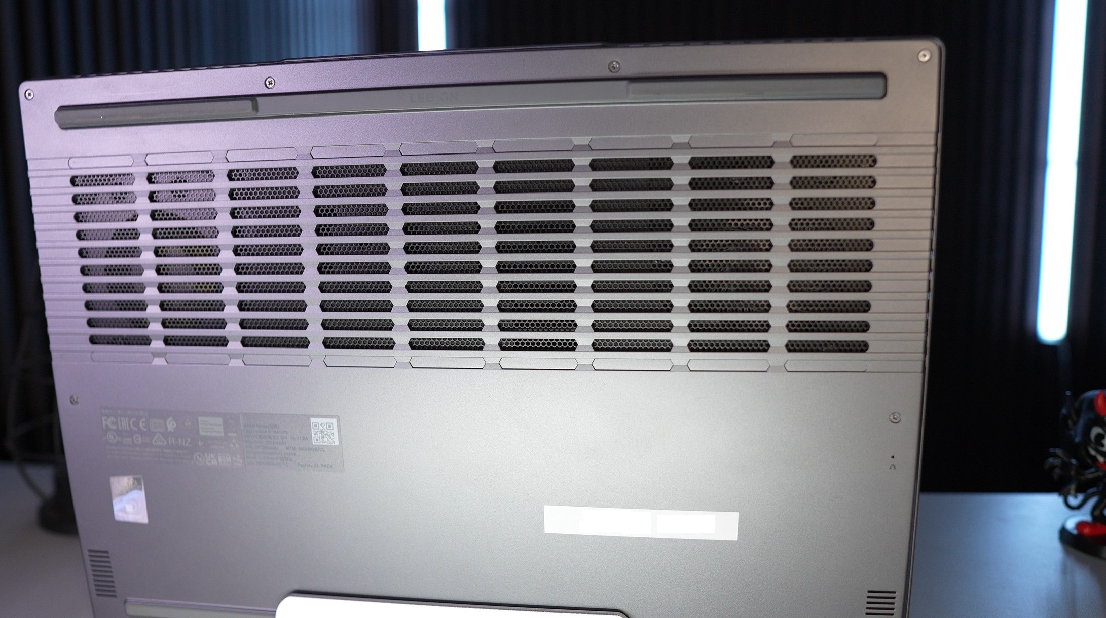 En la parte trasera del notebook, tenemos un diseño tradicional, una rejilla en la parte superior para la ventilación y con bastantes topes de goma, para que al ponerlo en la mesa el equipo tenga un poco de altura y permita que el aire entre por la parte inferior, y luego salga por los costados o parte trasera.