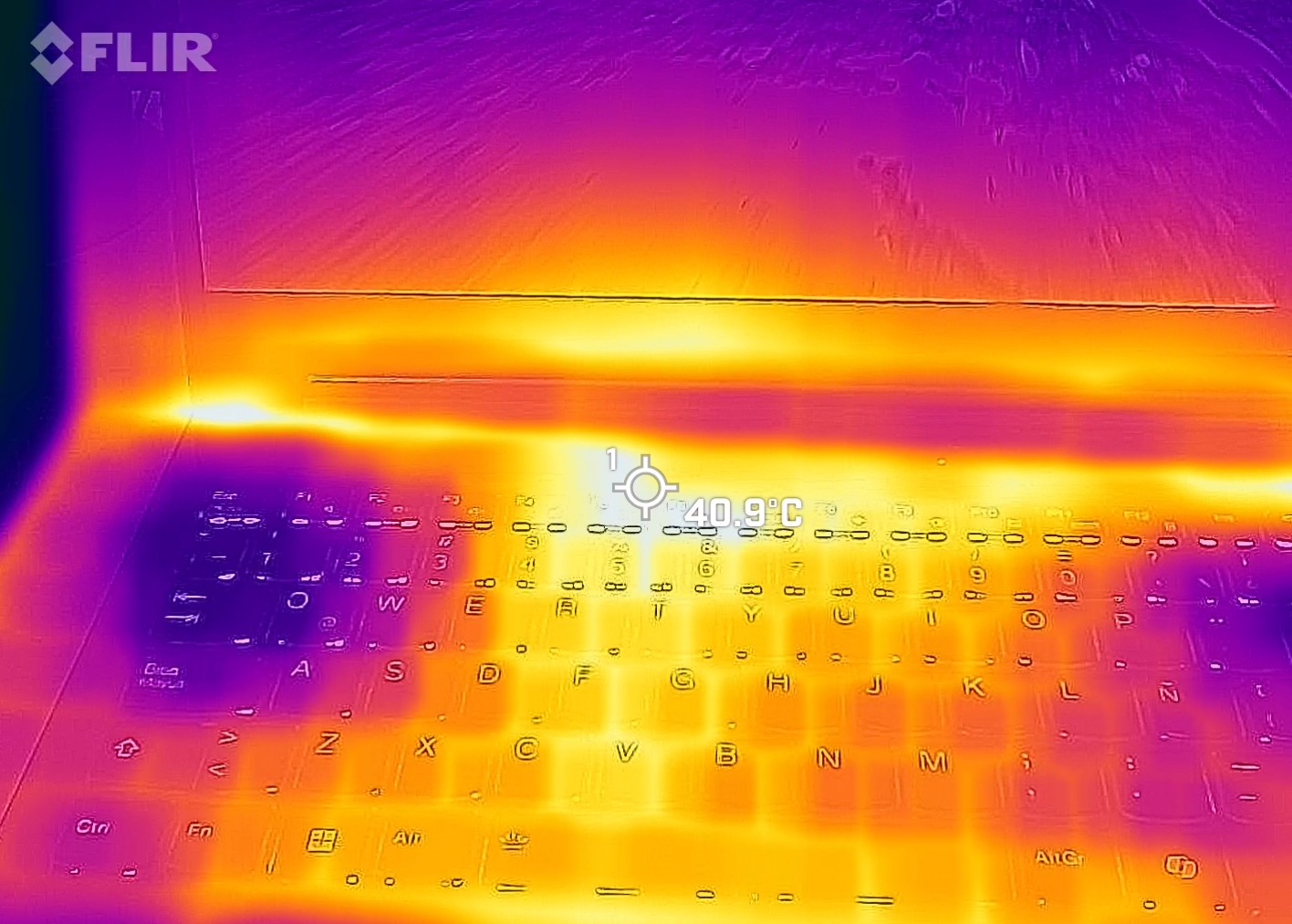 Ya para ir cerrando le realizamos una prueba al equipo mientras corríamos el benchmark de black might woukong y vimos las temperaturas del equipo, y como lo aprecian en un punto entre la pantalla y el teclado es la máxima temperatura, unos 41 grados, eso si al pasar la mano por el teclado no se percibe tanto calor, se puede ocupar el quipo sin problema.