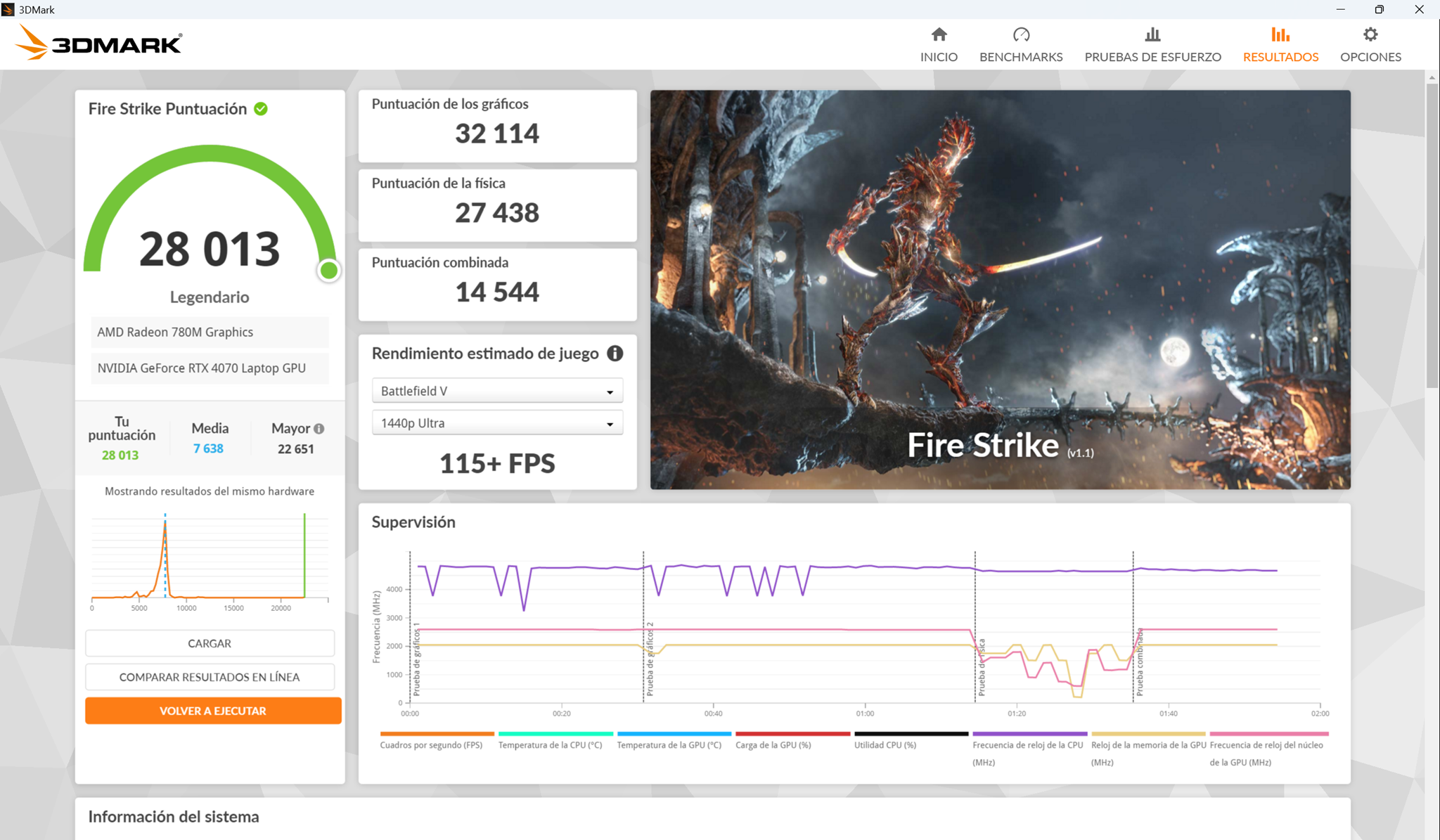 Si aquí repetimos lo del caso anterior, por ejemplo, en Firestrike, pasamos de 28013 puntos a 20600 puntos. Ojo ambos resultados no son malos, para nada, pero si vemos una perdida de rendimiento de un 37%, pero si vemos los resultados desglosados, es la tarjeta grafica la que mas baja rendimiento, de 32 mil puntos a 22 mil puntos.