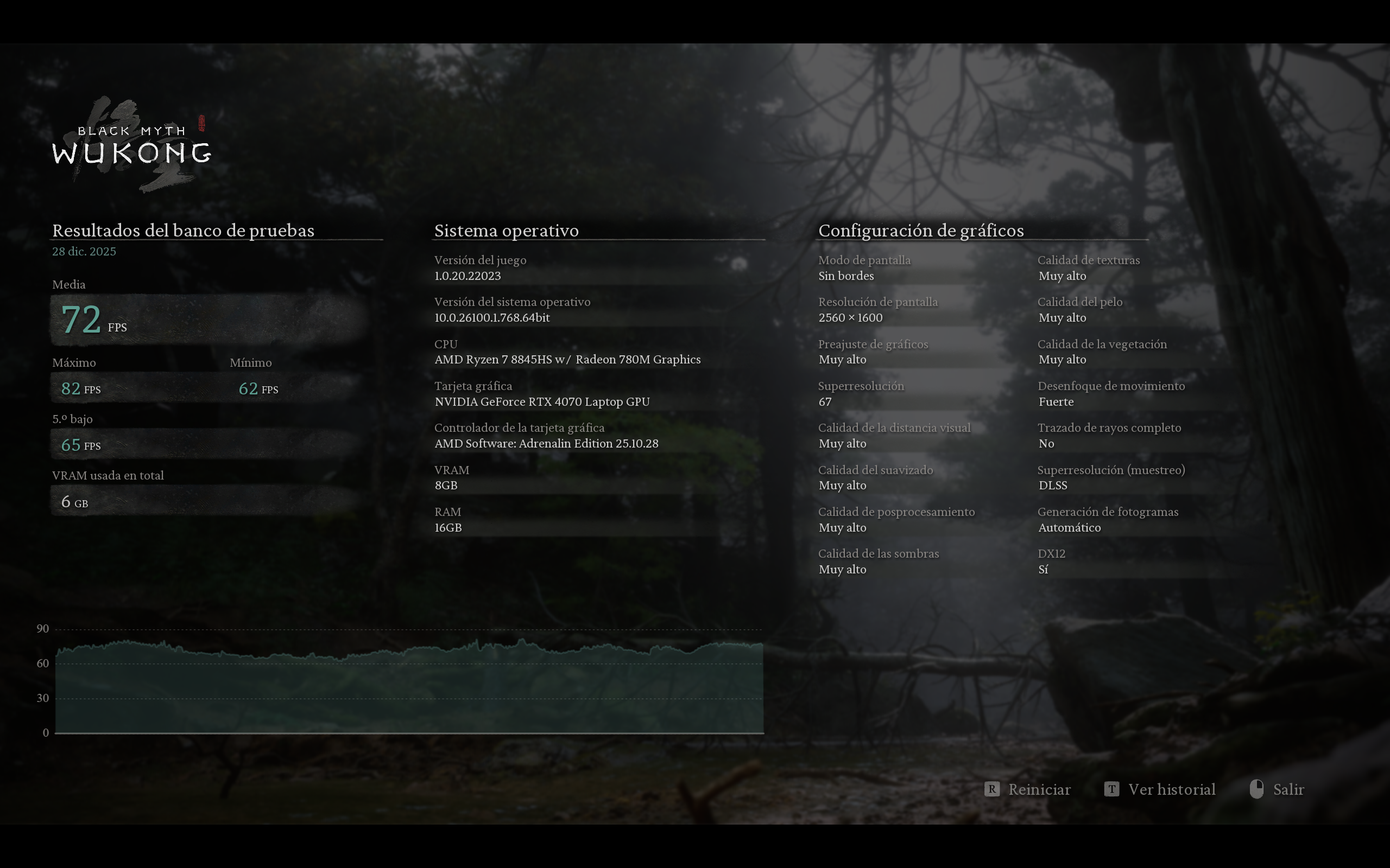 Black Might Woukong a 2560 x 1600 en Ajustes gráficos en Muy alto, DLSS en Calidad y Frame Generation activo, obtuvimos unos impresionantes 72 FPS.