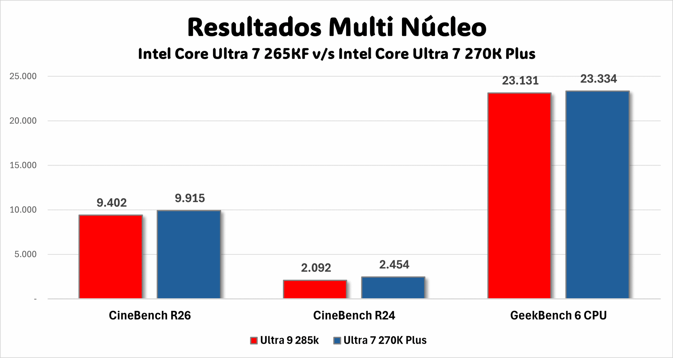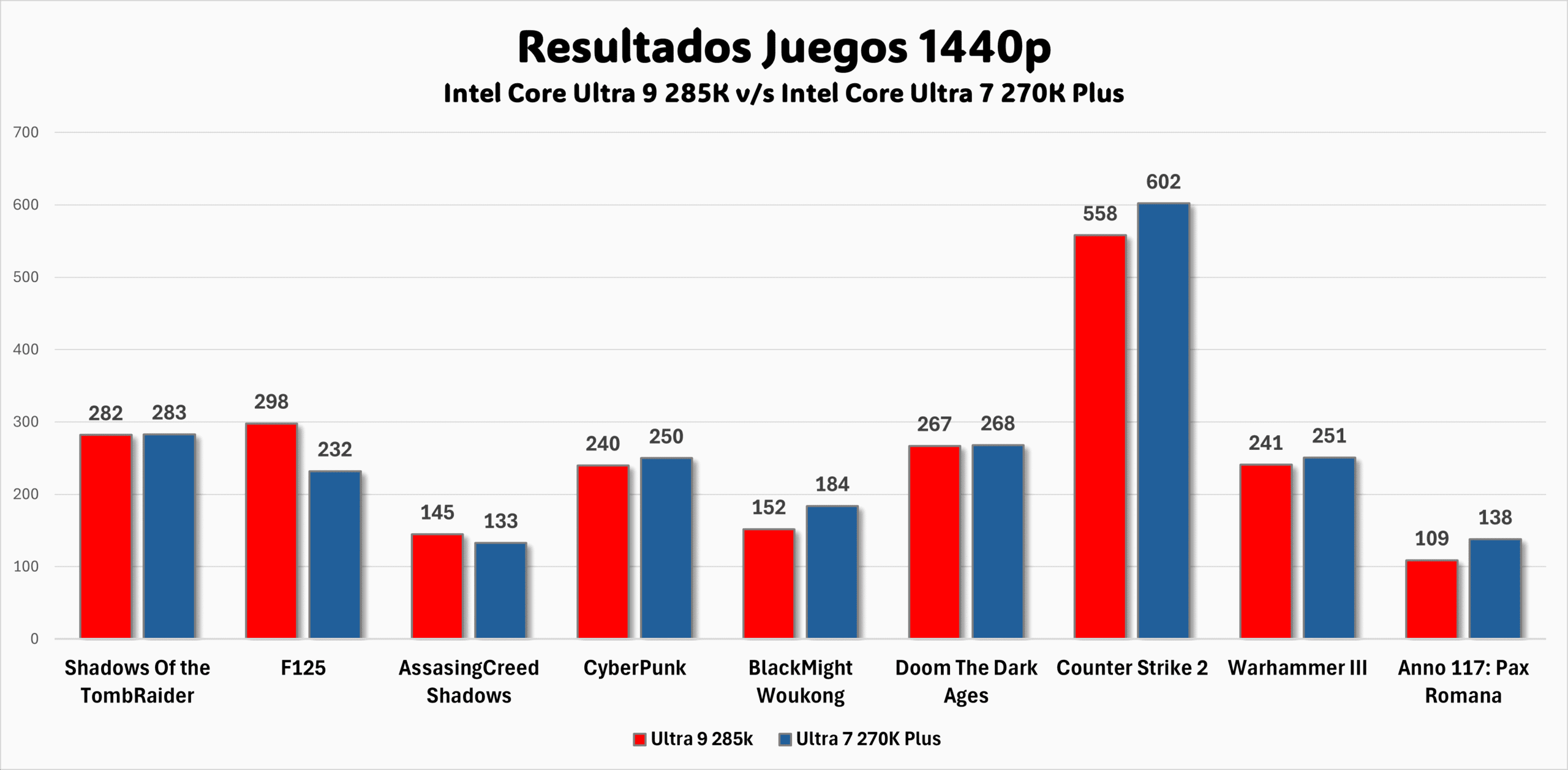 En este punto, surge una interrogante relevante acerca de la diferencia entre el Core Ultra 9 285K y el Core Ultra 7 270K PLUS. Dado que en esta versión ambos modelos presentan igual cantidad de núcleos y hilos, resulta pertinente realizar una comparación directa para evaluar su desempeño.